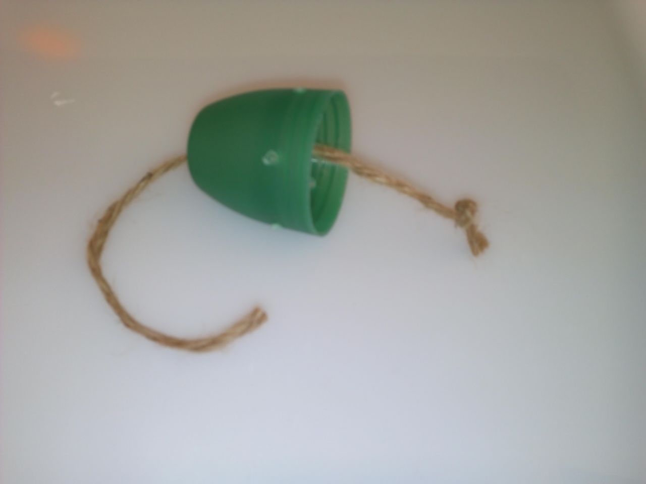 Escogeremos un tapón grande con forma de campana, si no se encontrase ninguno podríamos usar un vaso de plástico cortado, aunque quedará más endeble. Con la barrena, haremos un agujero en la parte superior del tapón y varios agujeros separados cerca del borde de abajo.
