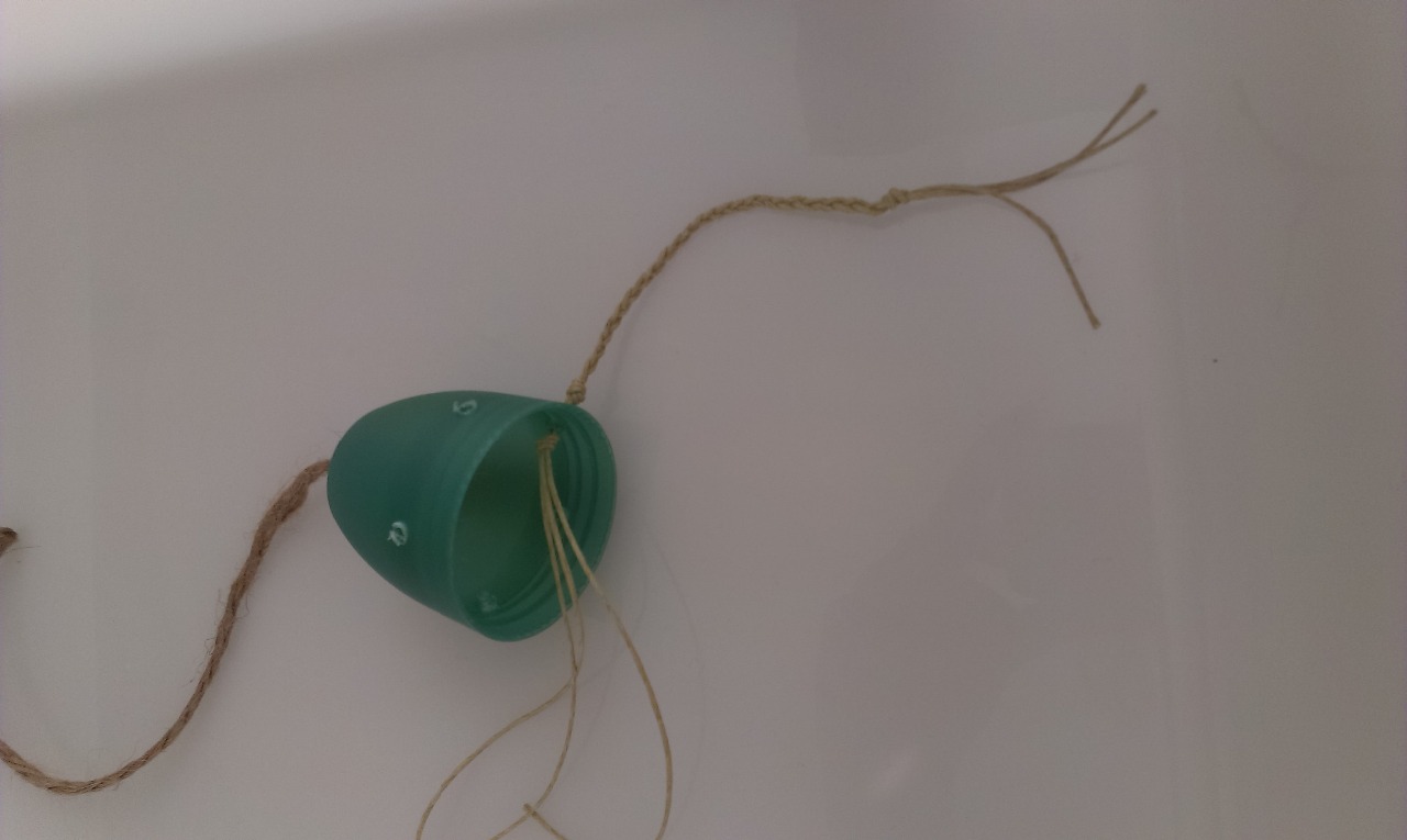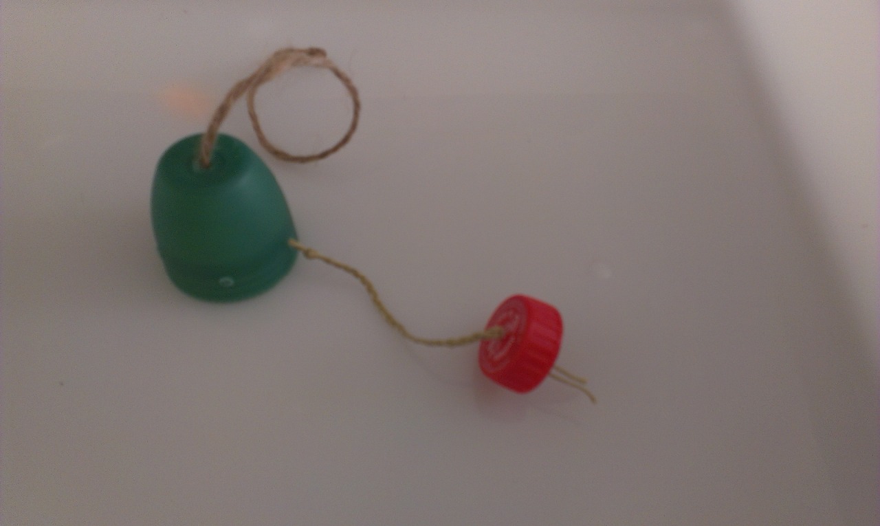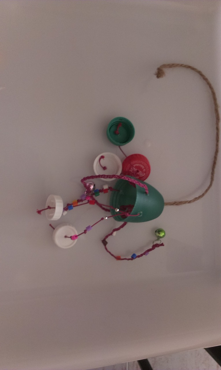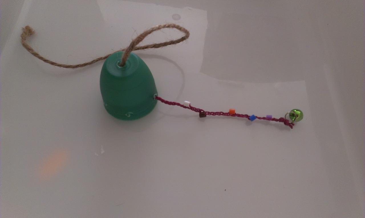 Pasaremos un trozo de cuerda por el agujero que hemos realizado arriba y haremos un nudo, de modo que sirva para atar el "pulpo" a la jaula de nuestros peques. Por el resto de agujeros podemos poner cuerda o bien hacer trenzas de cuerda de ratón, de ahí colgaremos los tapones, los cascabeles o lo que tengamos por casa.